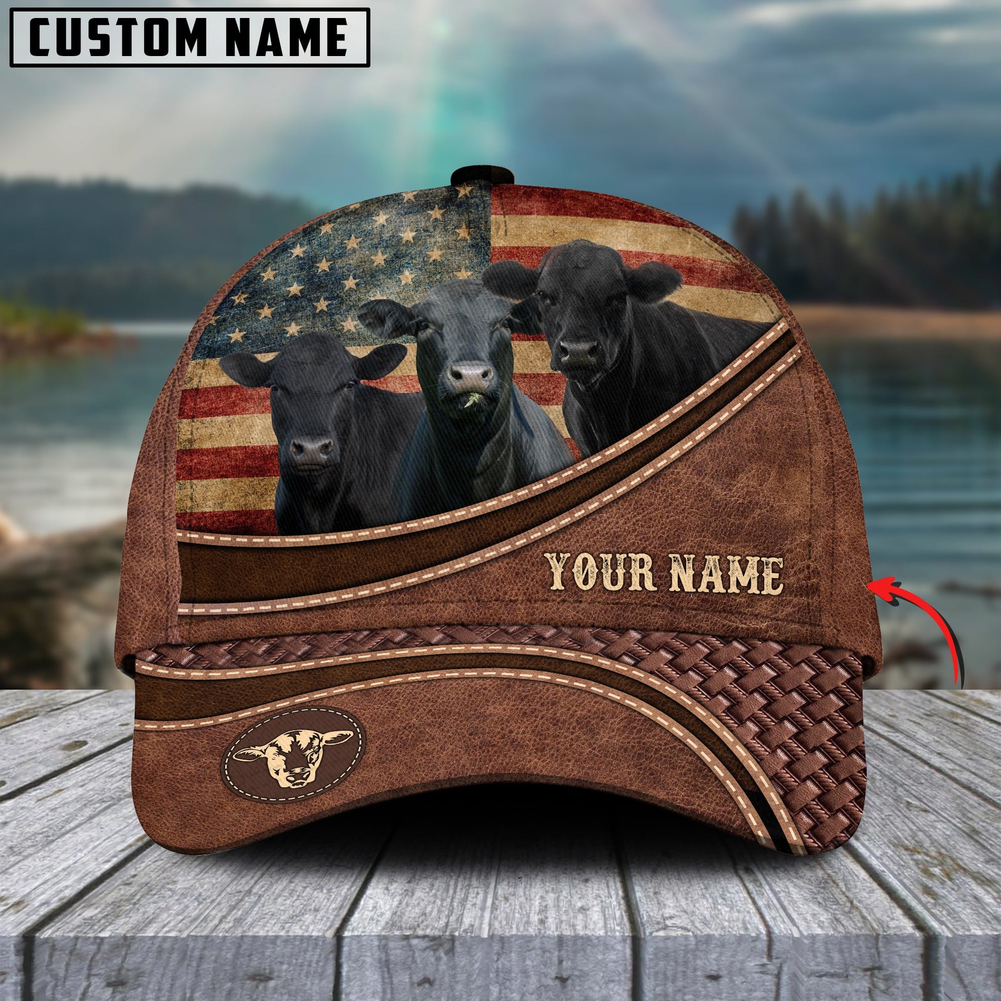Joycorners Black Angus US Flag Personalized Name Brown Carving Leather Pattern 3D Classic Cap