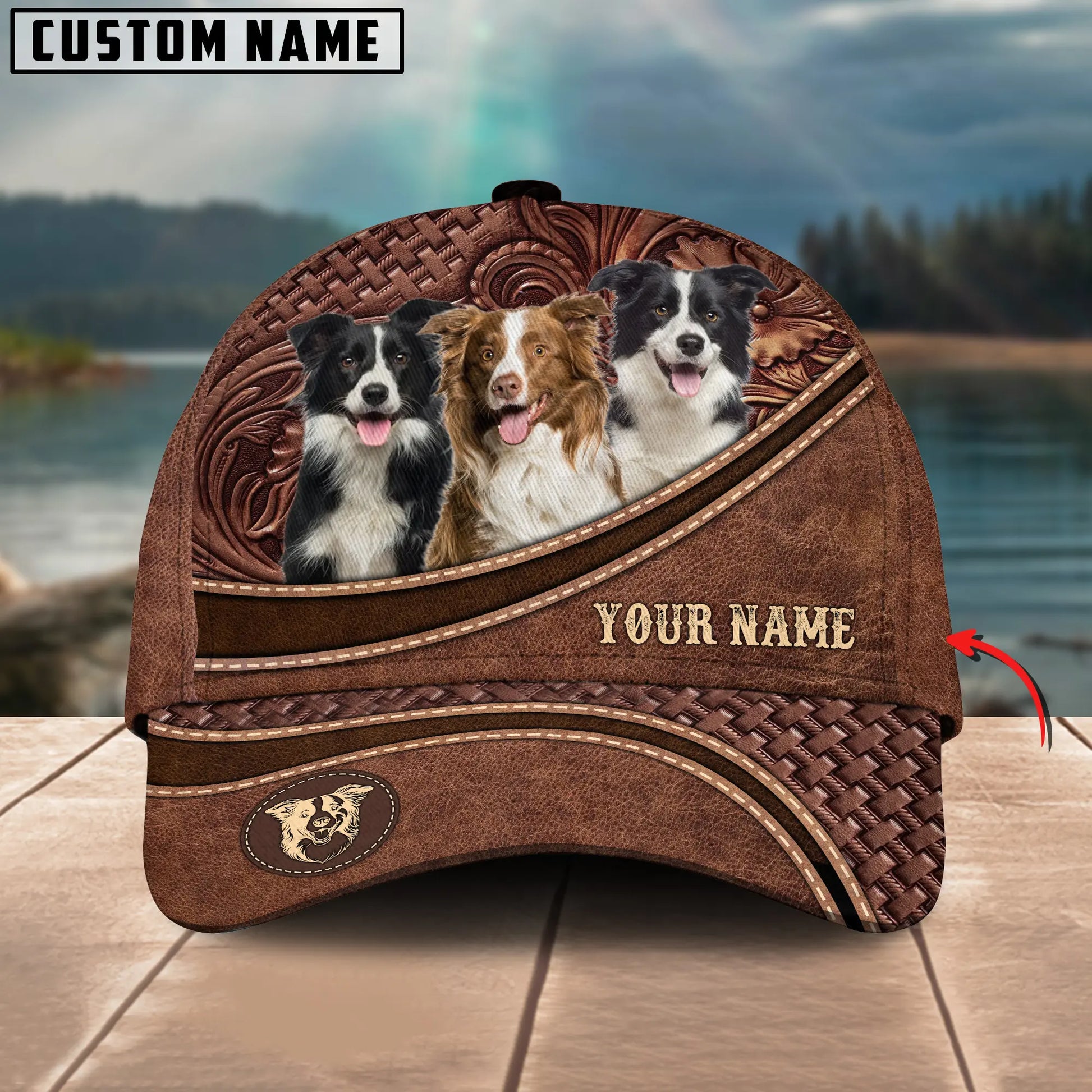 Joycorners Border Collie Personalized Name Brown Carving Leather Pattern 3D Classic Cap