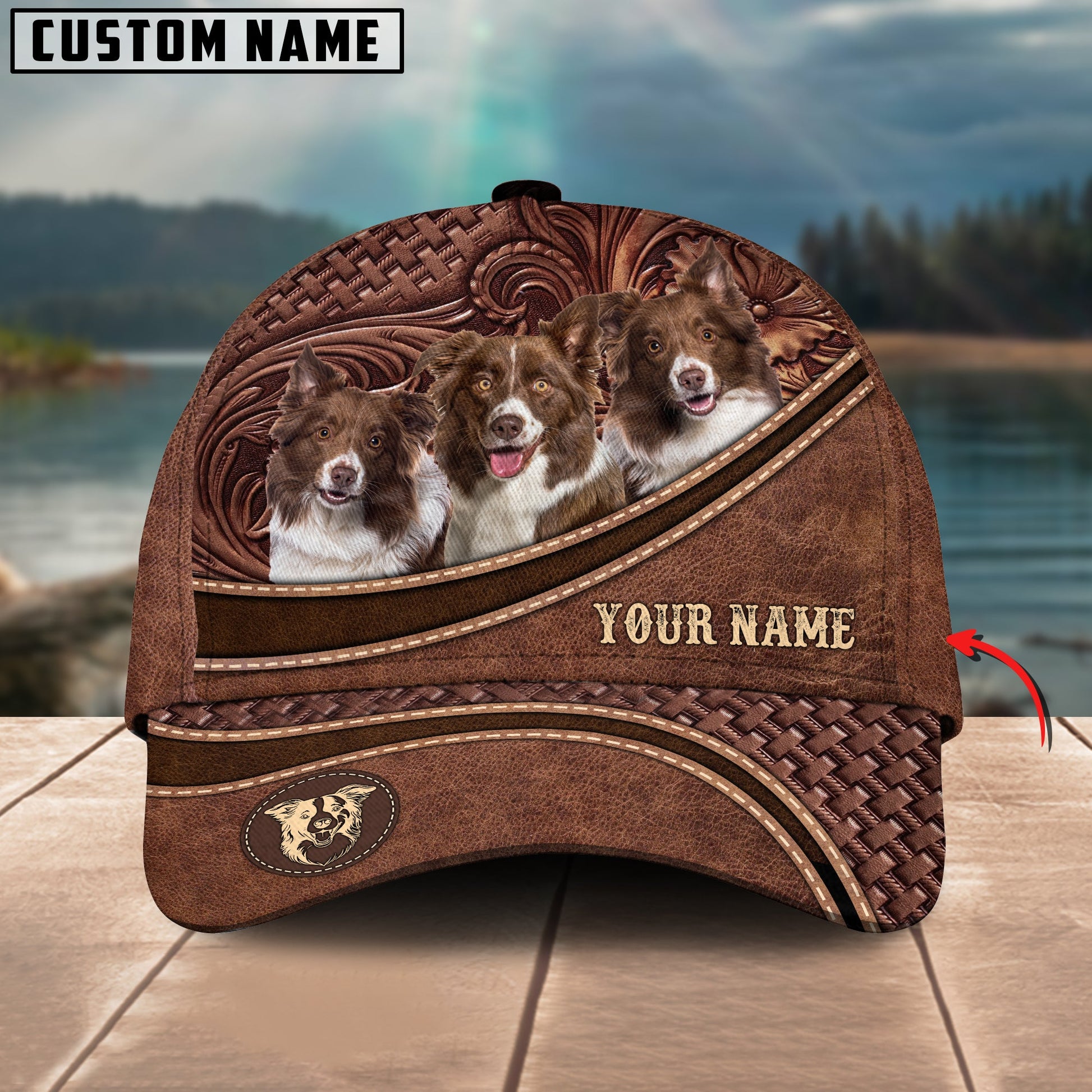 Joycorners Brown Border Collie Personalized Name Brown Carving Leather Pattern 3D Classic Cap