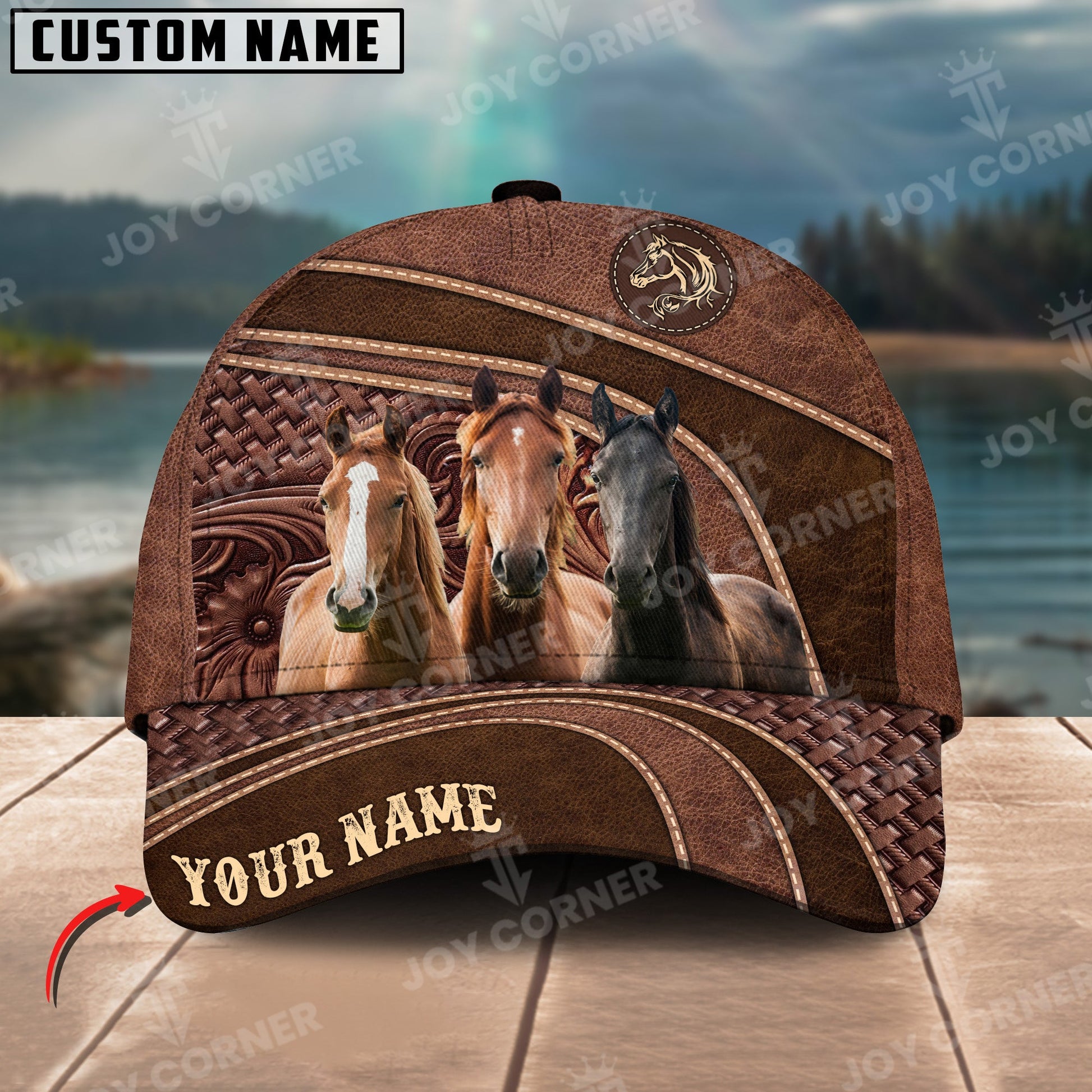 Joycorners Horse Personalized Name Brown Carving Leather Pattern 3D Classic Cap 1