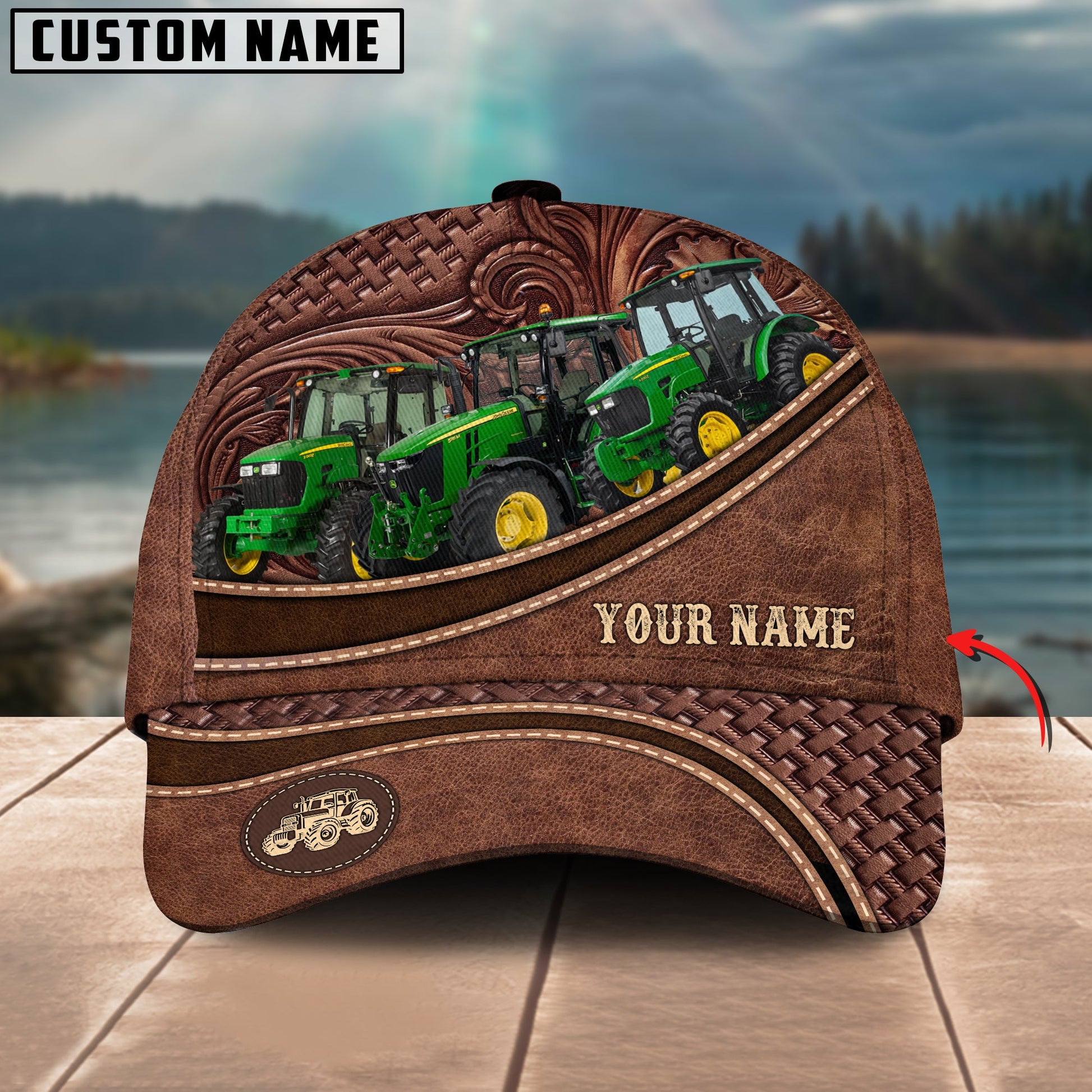 Joycorners John Deere Tractor Personalized Name Brown Carving Leather Pattern 3D Classic Cap