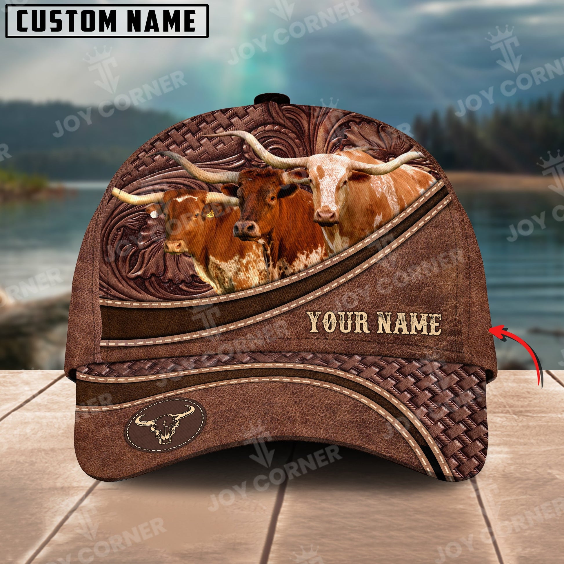 Joycorners Texas Longhorn Personalized Name Brown Carving Leather Pattern 3D Classic Cap