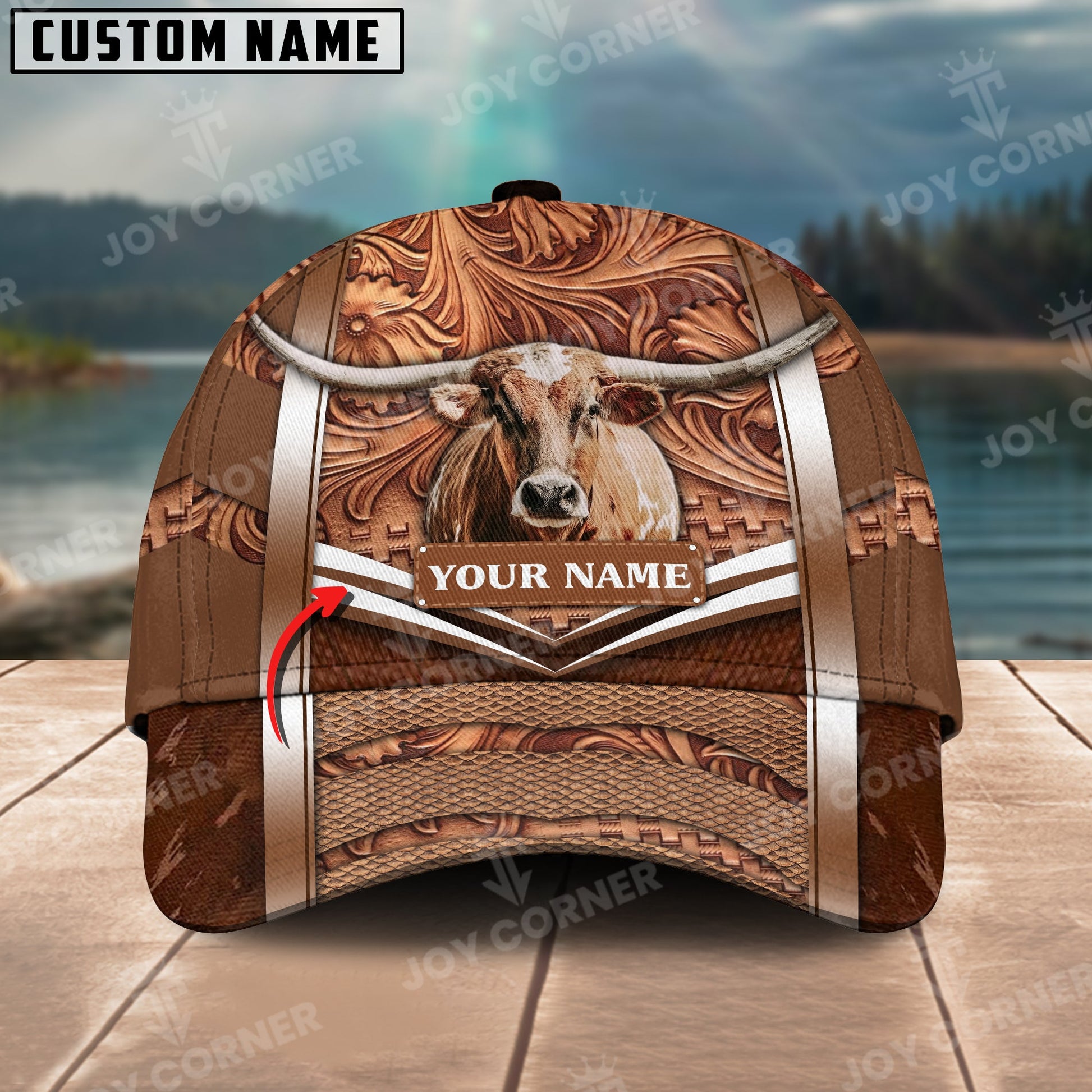 Joycorners Texas Longhorn Personalized Name Brown Carving Leather Pattern 3D Classic Cap